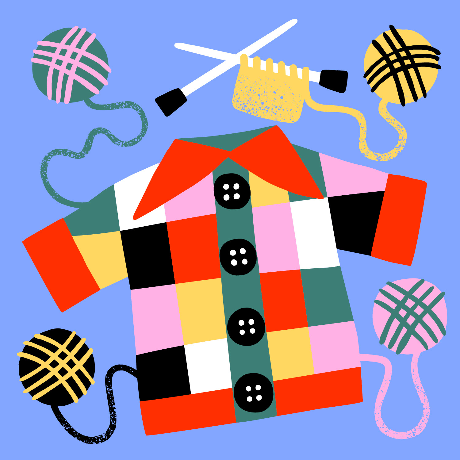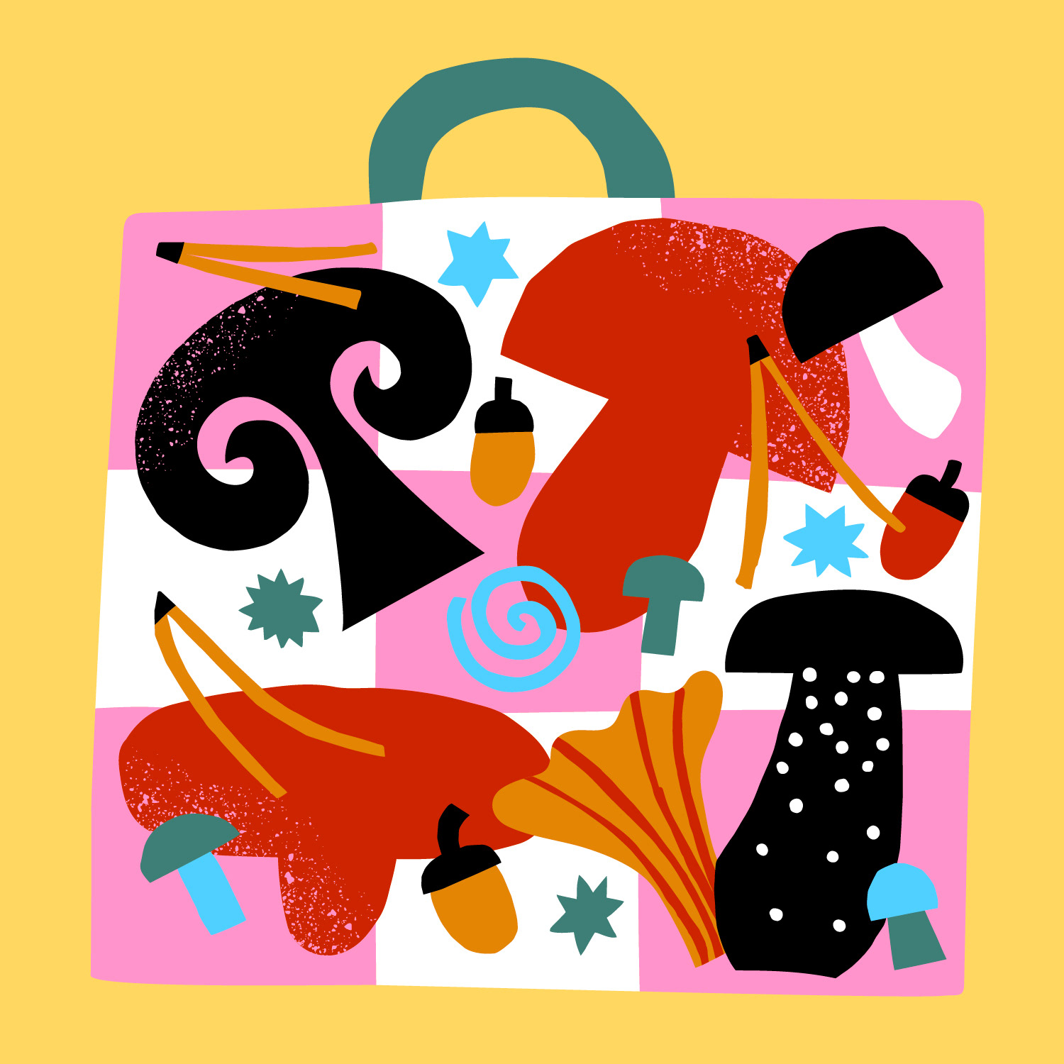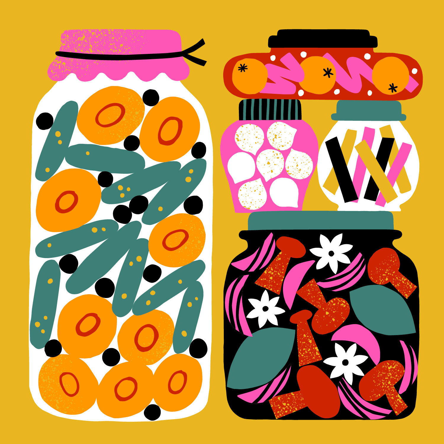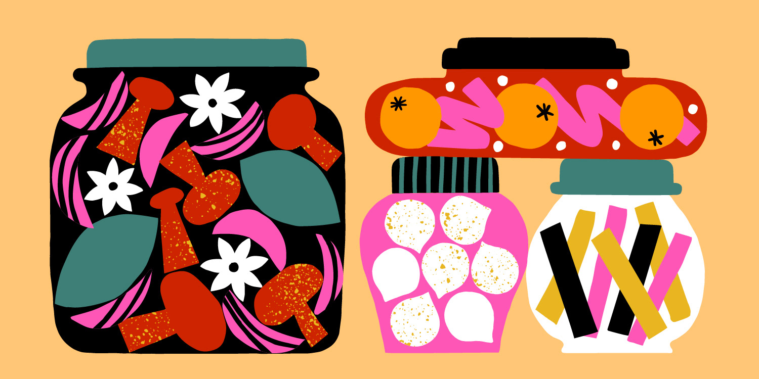 The illustrations depict typical Scandinavian activities around the house such as fermenting veggies, knitting, mushroom picking and calming beauty routines.