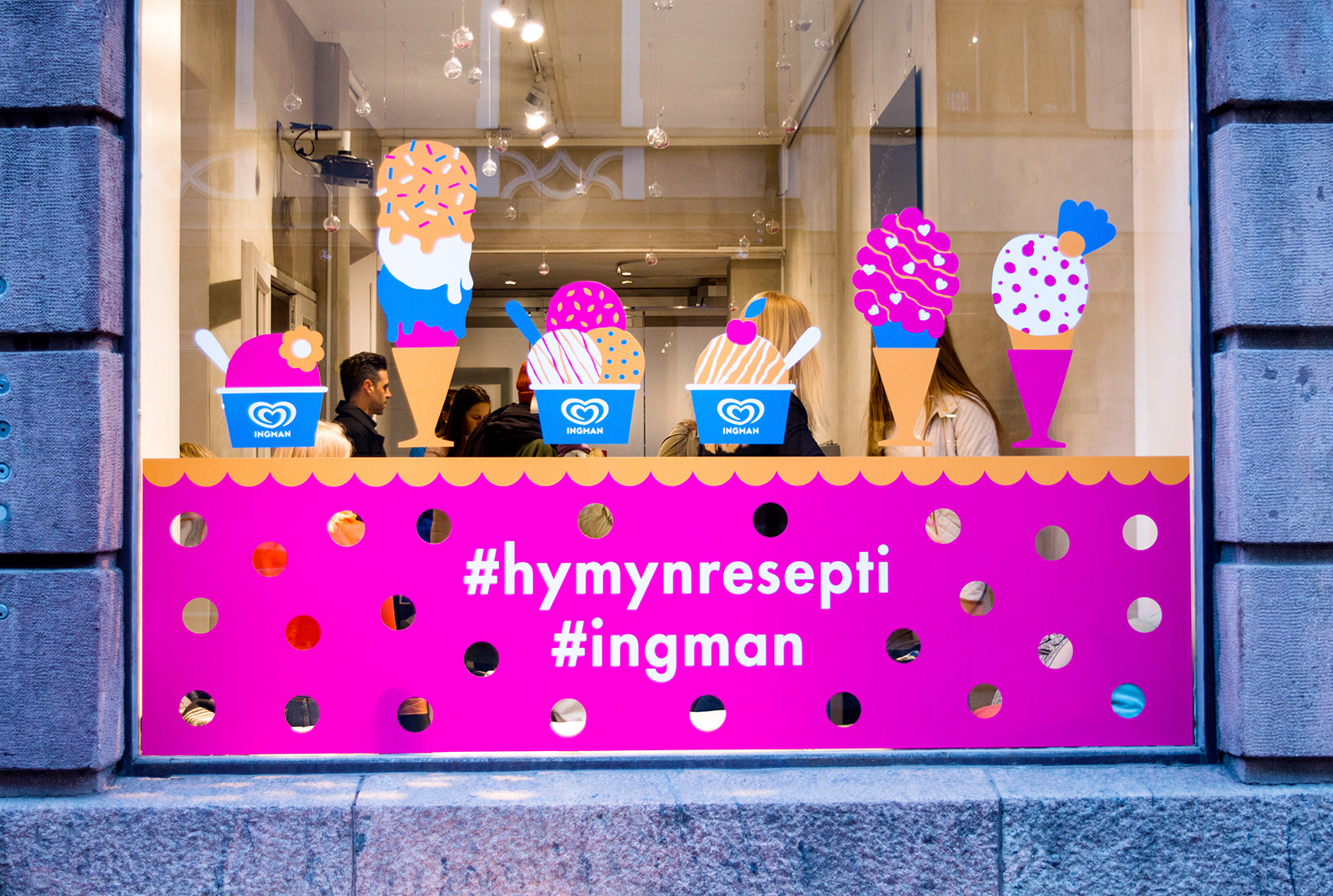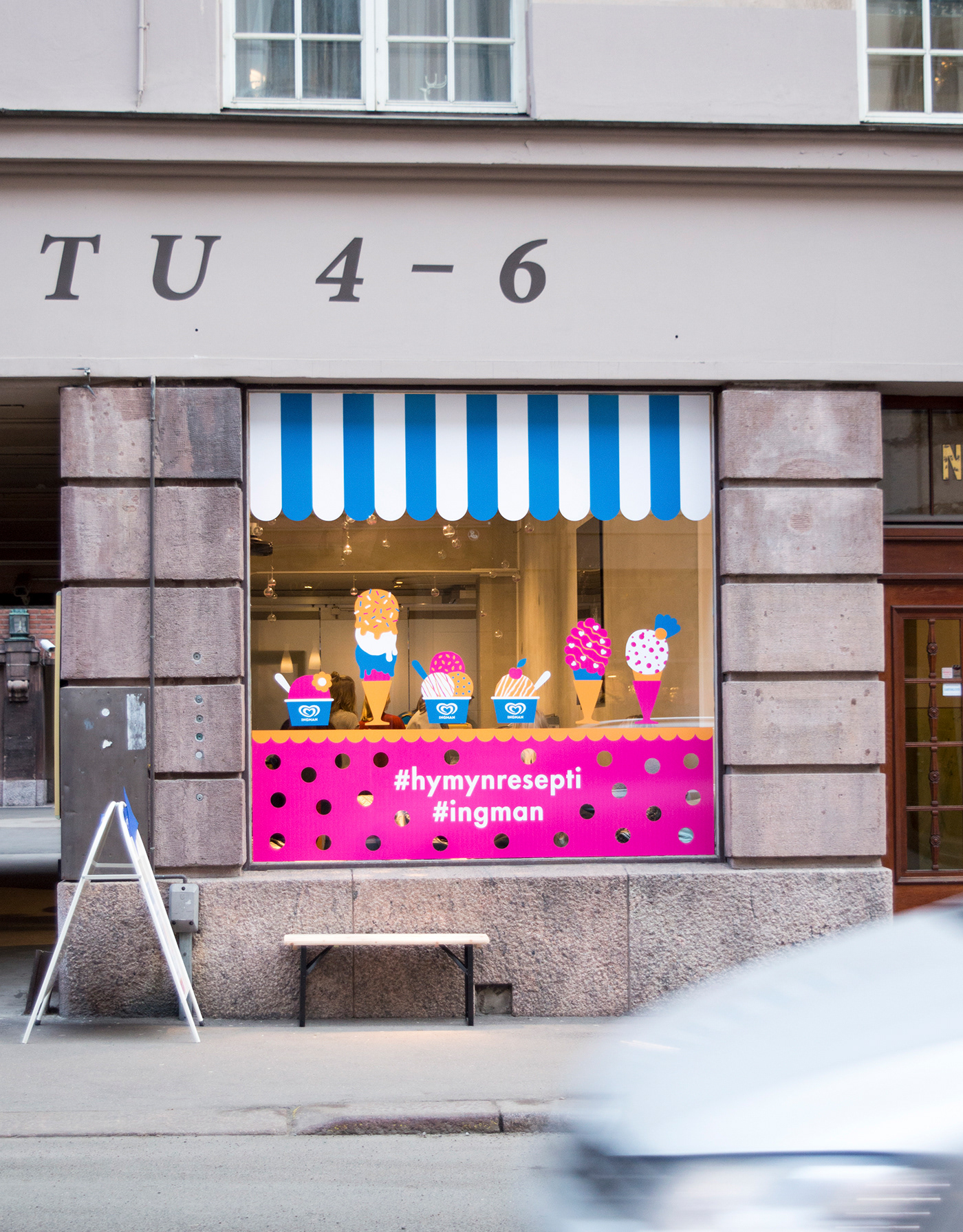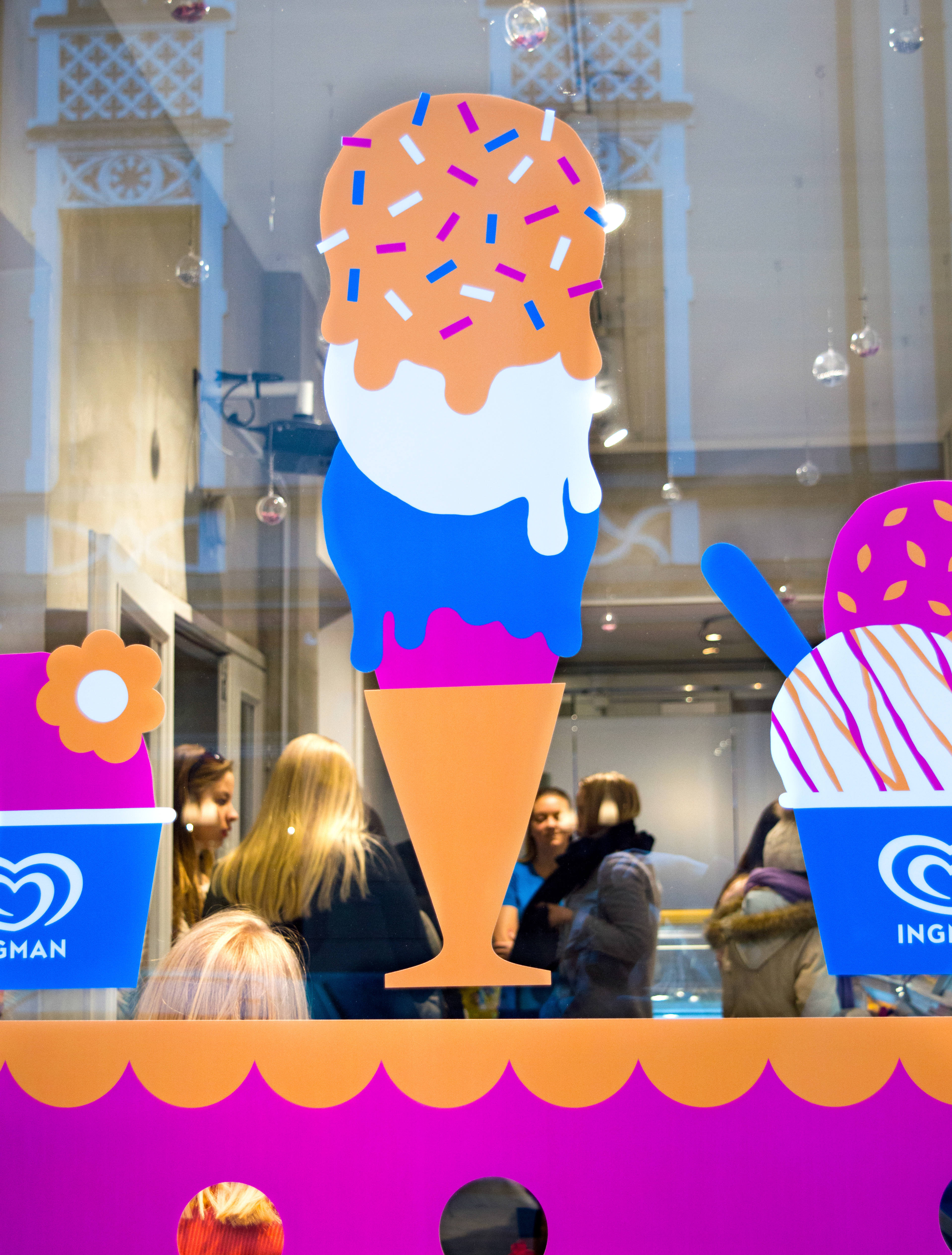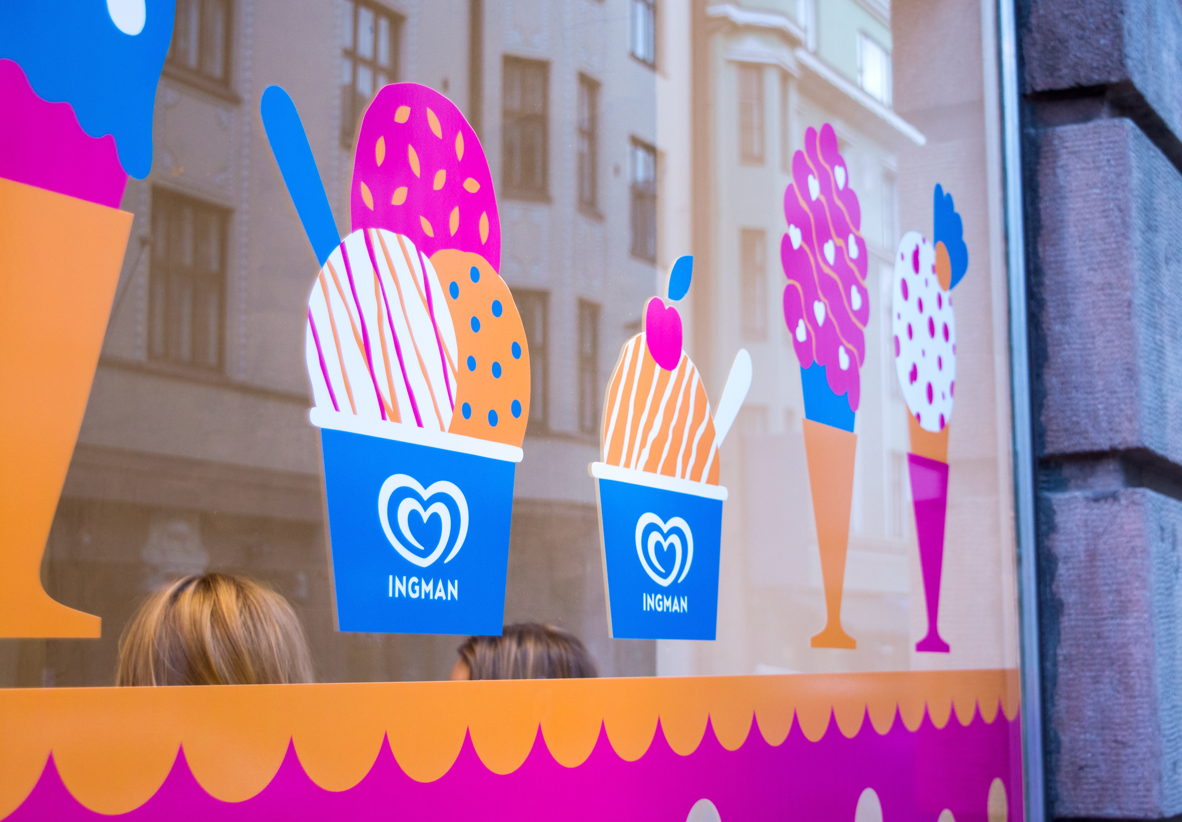 Window illustration for Ingman pop-up ice cream bar in Helsinki.